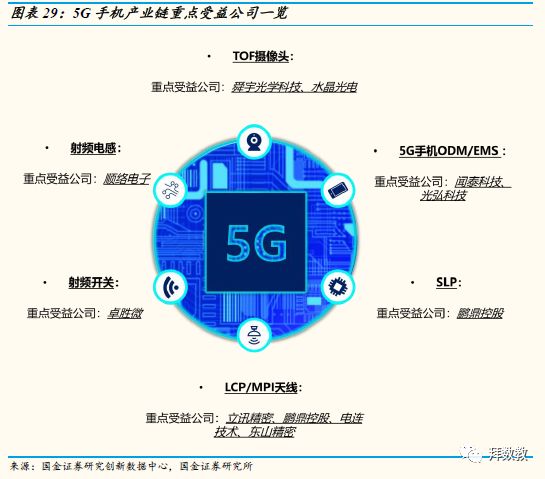 随着多款5G手机的上市, 5G 智能终端产业链有望迎来较好的发展机会。我们认为,随着 5G 手机的成本下降,2020 年5G 手机有望放量。看好5G手机射频前端、LCP/MPI、SLP、FPC、TOF等重点受益机会,详细分析可以参考国金证券创新技术与企业服务研究中心近期发布的报告《华为发布 5G 手机,5G 智能终端产业链迎来投资良机》。
