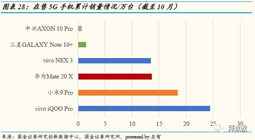 2019年被誉为5G商用的元年,近两个月陆续有多款5G手机上市,目前在售的5G手机包括华为Mate 20 X,vivo的iQOO Pro和NEX 3,小米9 Pro,中兴的AXON 10 Pro(5G)等,OPPO目前尚未有5G手机在售。根据国金证券研究创新数据中心的监测数据,截至10月份,5G手机的累计新增设备数超过70万台,其中vivo的iQOO Pro销量最高,接近24万台,小米9 Pro次之,销量为18万台。