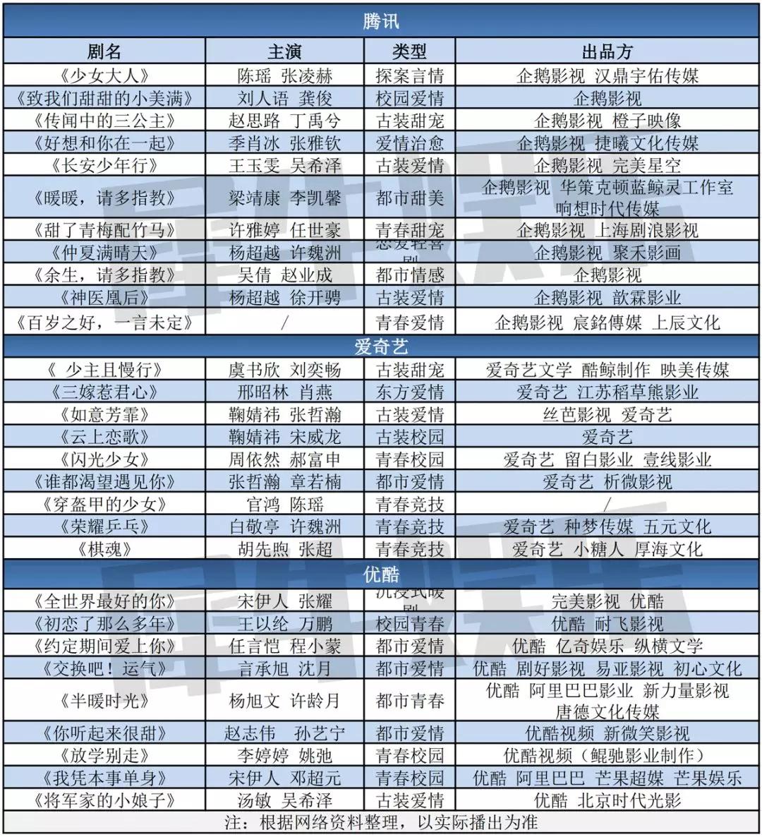 除此之外,华策、完美世界这两家传统影视公司也贡献颇丰。腾讯《致我们单纯的小美好》《我只喜欢你》皆由华策影视主控制作,2018年的高口碑青春剧《忽而今夏》则由企鹅影视和完美世界影视联合制作出品,优酷明年待播的《交换吧!运气》华策子公司剧好影视为出品方之一。