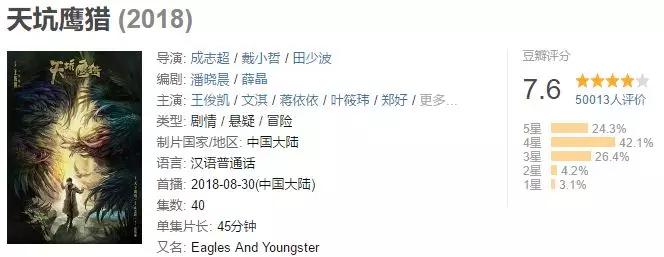 2018年8月,《天坑鹰猎》在优酷上线1小时播放量破亿,收官累积播放量超42亿,豆瓣评分7.6,评分人数50013。