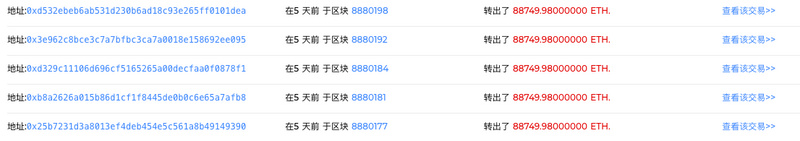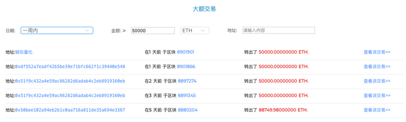 本周,“5 万 ETH 以上”转账次数共计 12 笔:其中一笔为币安内部地址互转,金额为 8.7 万 ETH;另外 11 笔疑似是量化交易,金额分别是 5 万 ETH(四笔)、88749 个ETH(七笔)。