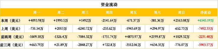 资金方面,本周资金波动较大,周四净流出资金最多,超过 2000 万美元;周一净流入资金较高,超过 4000 万美元。