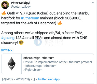 11月7日,以太坊核心开发者Péter Szilágyi发推表示,Geth v1.9.7(Quad Kicker)已发布。此版本将在区块高度9069000进行伊斯坦布尔硬分叉(预计12月4日)。