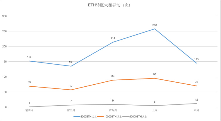 Tokenview数据显示,链上转账次数本周小幅上升,其中 “5 千 ETH 以上”与“1 万 ETH 以上”转账次数均下降,分别下跌 40%、26%;“5 万 ETH 以上”转账次环比上涨 140%。