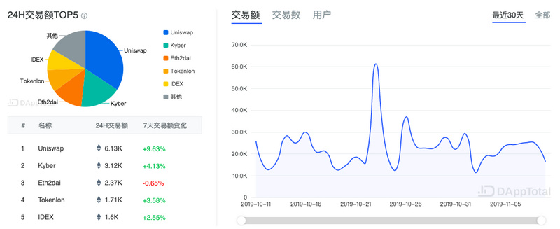 据 DAppTotal.com DEX专题页面数据显示:已统计的 30 个基于以太坊网络的 DEX 项目,过去一周链上交易额共计 152350 ETH(约 2894 万美元),环比下跌 4.5%。