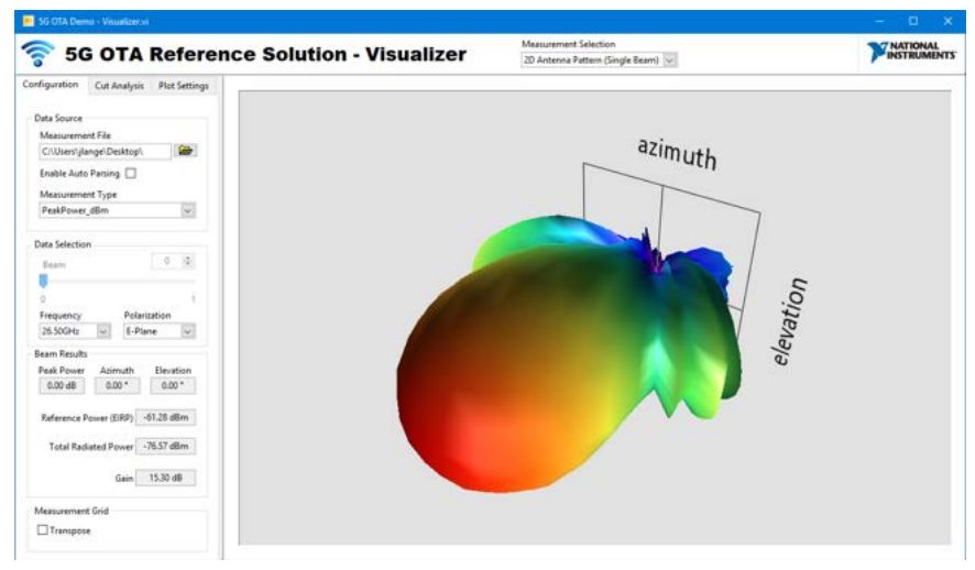 NI 毫米波 OTA 参考解决方案就是一种 OTA 测量系统。该系统包含用于波形生成和分析的 NI 高带宽毫米波矢量信号收发仪(VST)、高增益天线以及具有高精度实时运动控制定位器的射频电波暗室。借助测试序列生成器,工程师可以配置该解决方案,以便分析 DUT 波束成形功能的特性并对其进行验证。该解决方案还包含一套完整的软件,为测得的数据提供了一系列可视化选项。