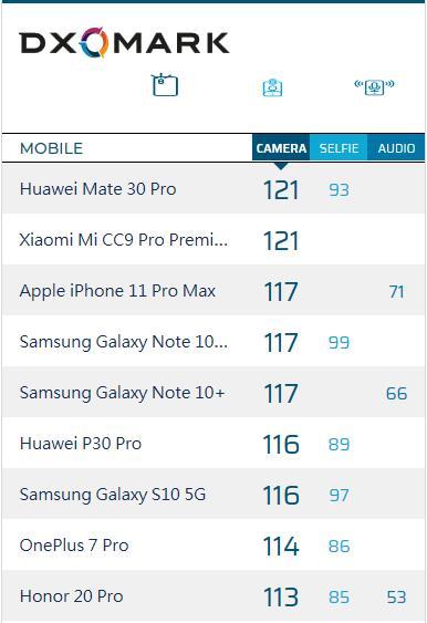 时至今年,该排名变化为总分上,华为Mate30 Pro为121分,排名依然是第一;小米CC9Pro尊享版为121分,与华为Mate30 Pro并列第一;iPhone 11 Pro Max为117分,与华为Mate30 Pro相差4分,位列第三(实际上是第二)。
