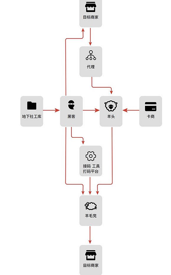 根据同盾科技的数据报告,过去的几年间,羊毛党已经发展成为一只庞大的力量,薅羊毛过程中需要的各种资料、手段、工具,促生了上游的各种灰色产业,比如:接码平台、商业化的注册机、代理平台、资料提供方和账号提供方,整个薅羊毛的产业链的结构大致如下: