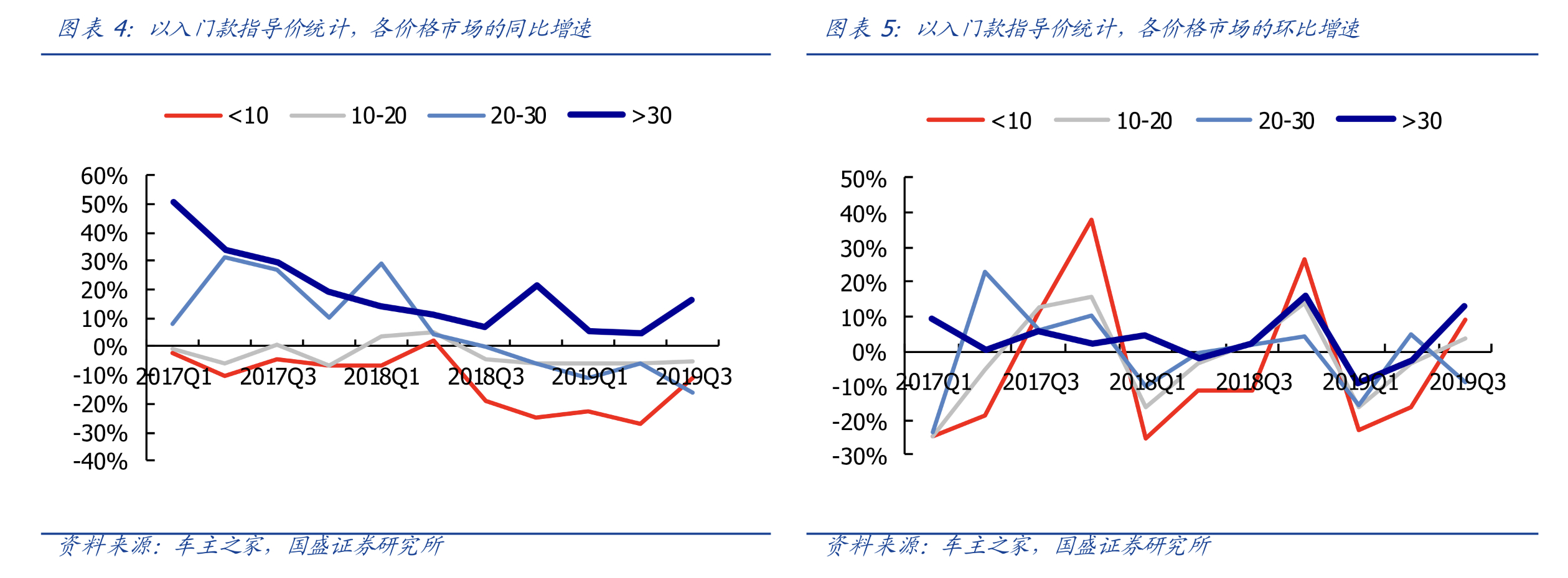 国盛证券统计数据显示,2019年第三季度10万元以下新上市车型数量占比达47%,行业占比同比提高了11.2%,而10万-20万元、20万-30万元以及30万元以上价格区间的新上市车型行业占比同比涨幅分别为2.5%、-8.4%和-5.3%。