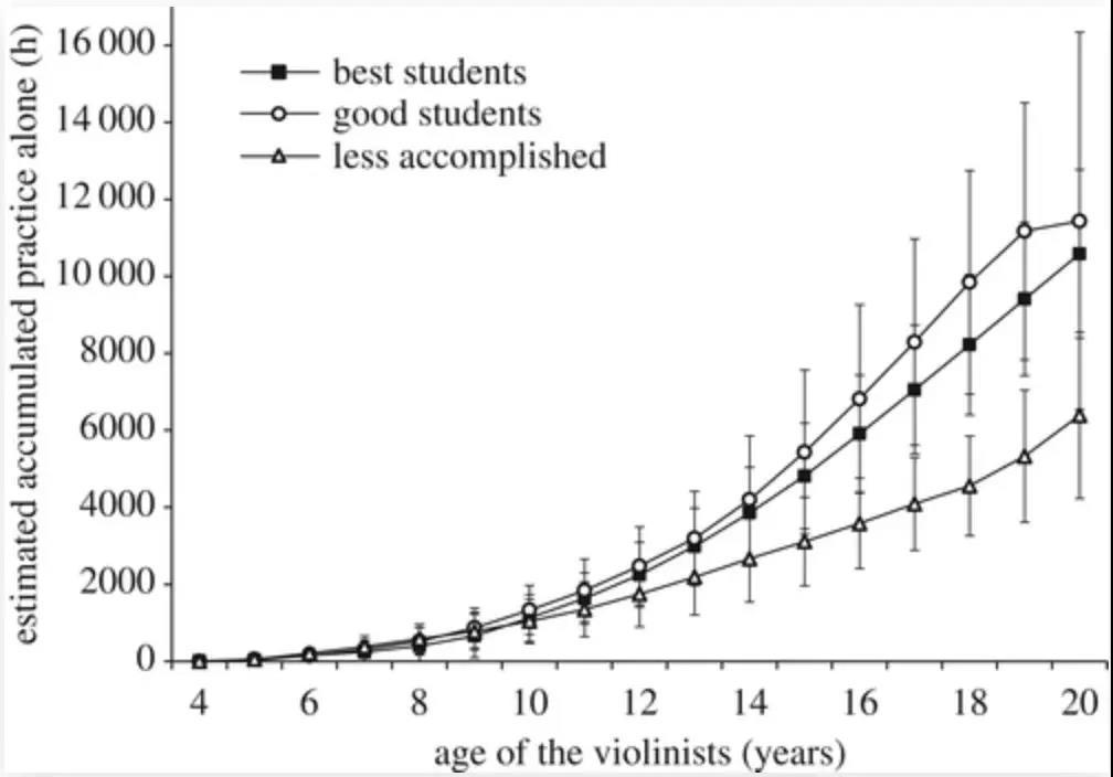 1993年《心理学评论》刊载的研究表明:最优秀的小提琴演奏家是在练习中投入时间最多的人。这个观点随后被作家格拉德维尔(Gladwell)在《异类》一书中总结为“一万小时定律”并流传甚广。