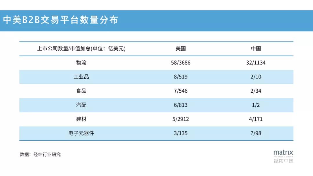 在上表中,我们将美国和中国产业供应链相关上市公司进行了一个对比。可以看到,在平均每个行业内的产业供应链上市公司的总市值规模和数量上,美国是中国的3倍到10倍。20年前,中国缺乏大的ToC流通渠道,带来了电商的大繁荣。今天中国在ToB供给的匮乏,将带来B2B交易平台(产业新供应链公司)的大繁荣。