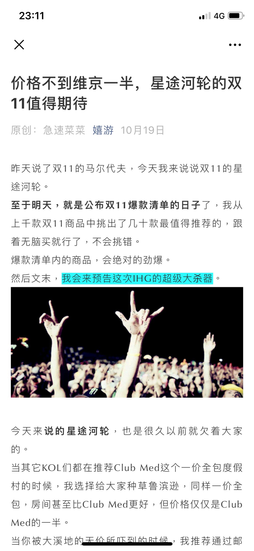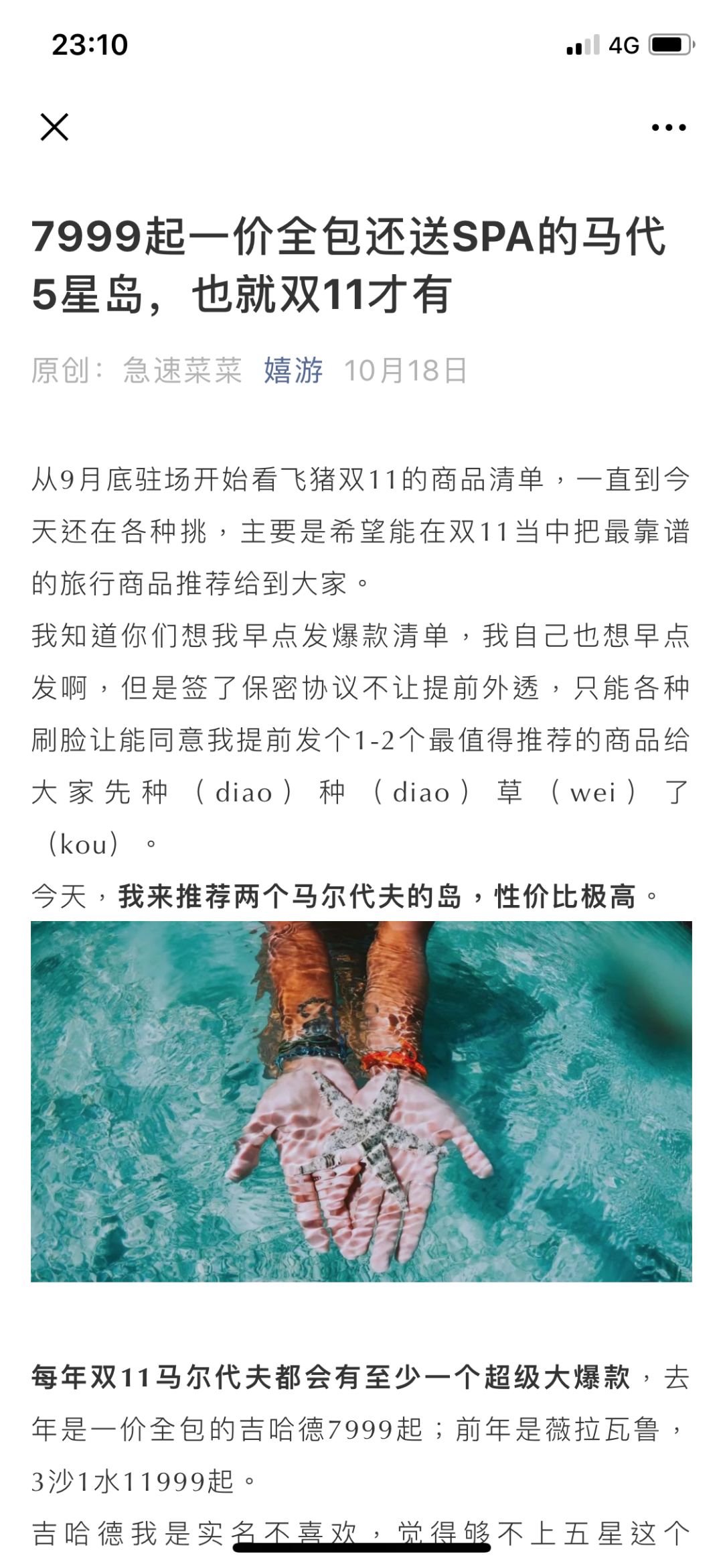 22点03分,菜菜(公众号:《嬉游》主理人)按下发送键,将一篇名为《7999起一价全包还送SPA的马代五星岛,也就双11才有》的文章推送至24万粉丝眼前,其内容是为马尔代夫瓦露岛飞猪双十一促销进行预热。