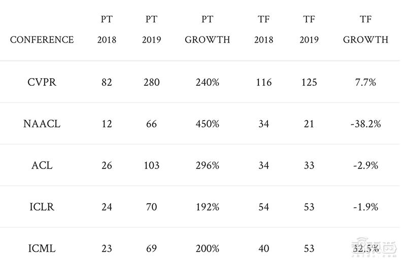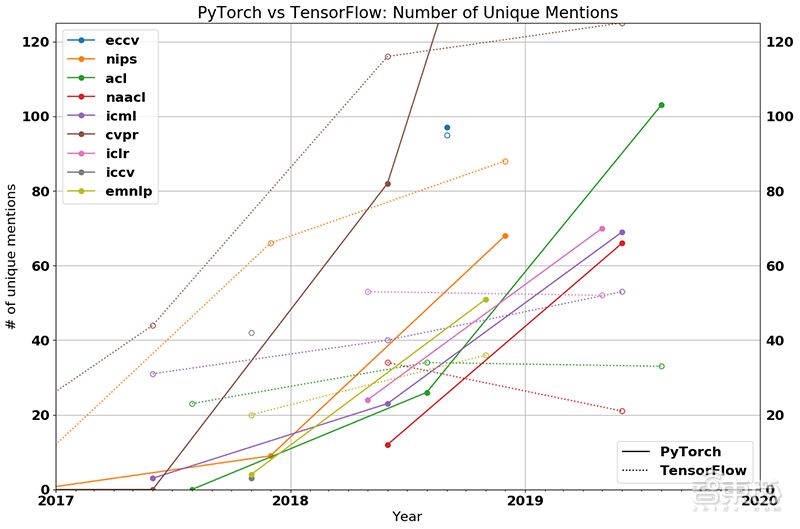 2017年1月,Facebook推出机器学习框架PyTorch。近两年来,PyTorch持续大举收割AI学术开发者,并且今年在视觉、语言、通用机器学习等多个顶会的论文流行度碾压TensorFlow,成为AI学术界新的王者。