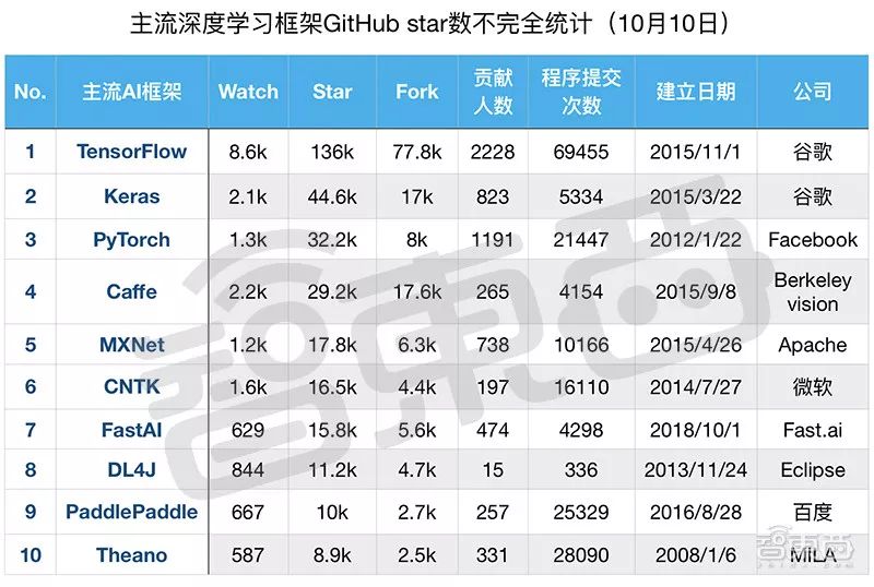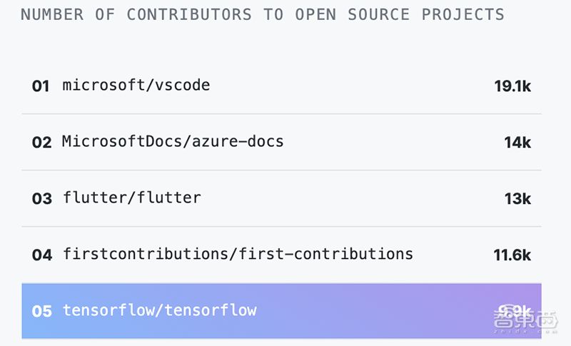 11月7日,GitHub发布年度报告,贡献者最多的TOP10开源项目中,谷歌AI框架TensorFlow排名第五(9.9K)。