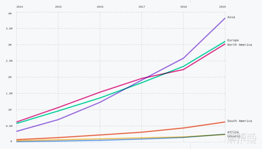 过去一年,亚洲开发者社区在2019年增长迅速,约36%的私人存储库创建自中国、印度、日本等亚洲开发者。