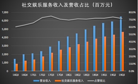 再看社交娱乐服务收入,报告期内,腾讯音乐社交娱乐服务营收46.6亿元,同比增长32.9%,占总营收的71.6%。社交服务收入超在线音乐服务收入2.5倍,该项营收增长主要是由于在线K歌和直播业务的收入增长。社交娱乐服务主要来自全民K歌的虚拟礼物和增值会员。