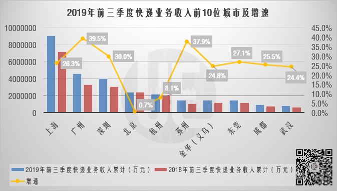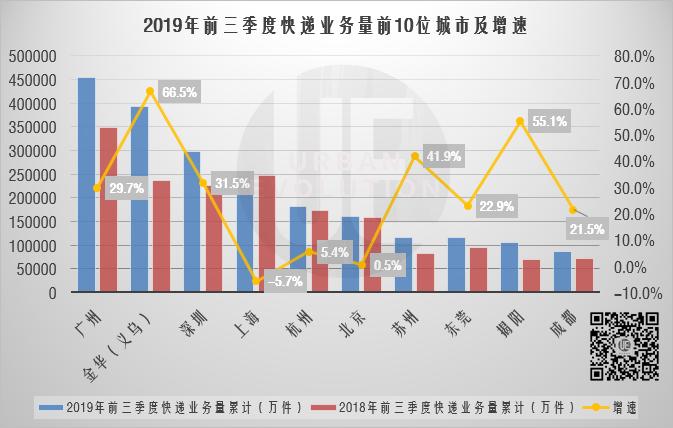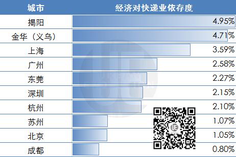 根据今年前三季度的数据,在快递业务量排名前10位的城市中,揭阳、金华、东莞等城市经济对快递业的依存度(快递业务收入/地区生产总值)排名均较为靠前,快递业对城市经济的整体发展影响甚大。