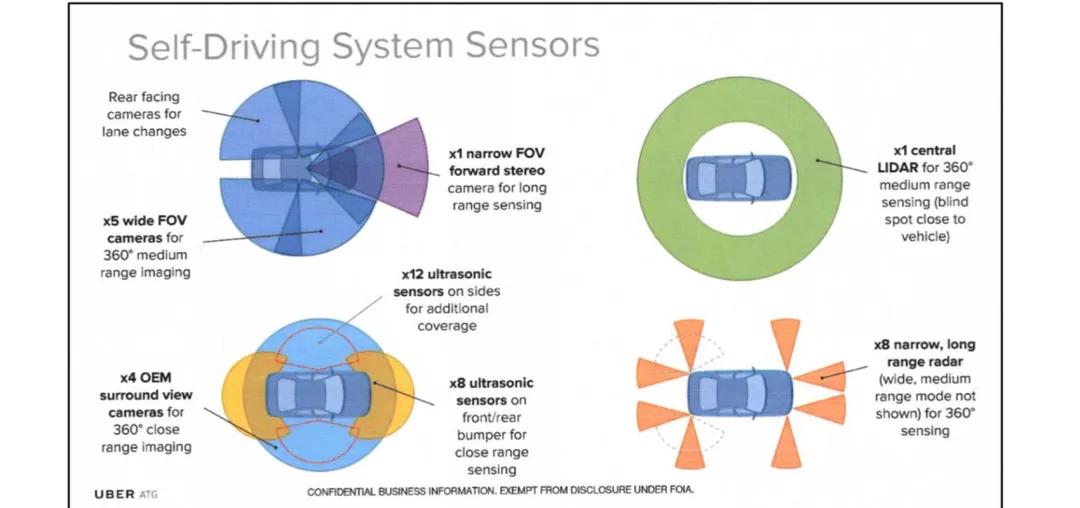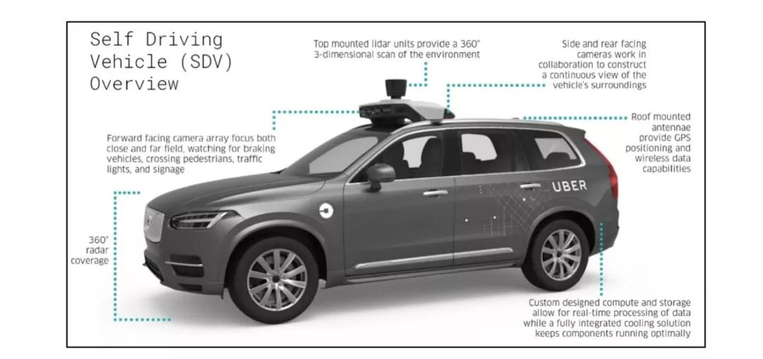 Uber 基于沃尔沃 XC90 车型改装的自动驾驶测试车搭载的传感器配置图 | 官方文件截图