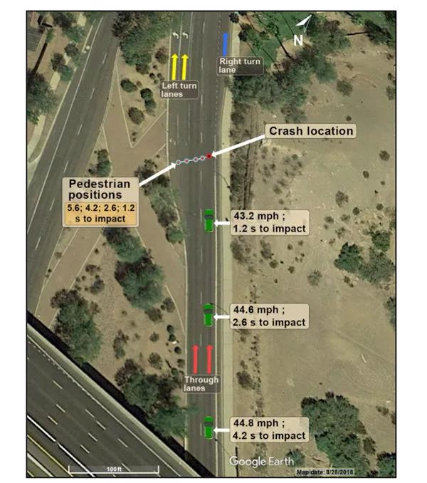 所以,在距碰撞发生不足 1 秒时,驾驶员才试图操控方向盘来躲避行人,在碰撞发生后不到 1 秒的时间内才开始踩下刹车,但一切为时已晚。