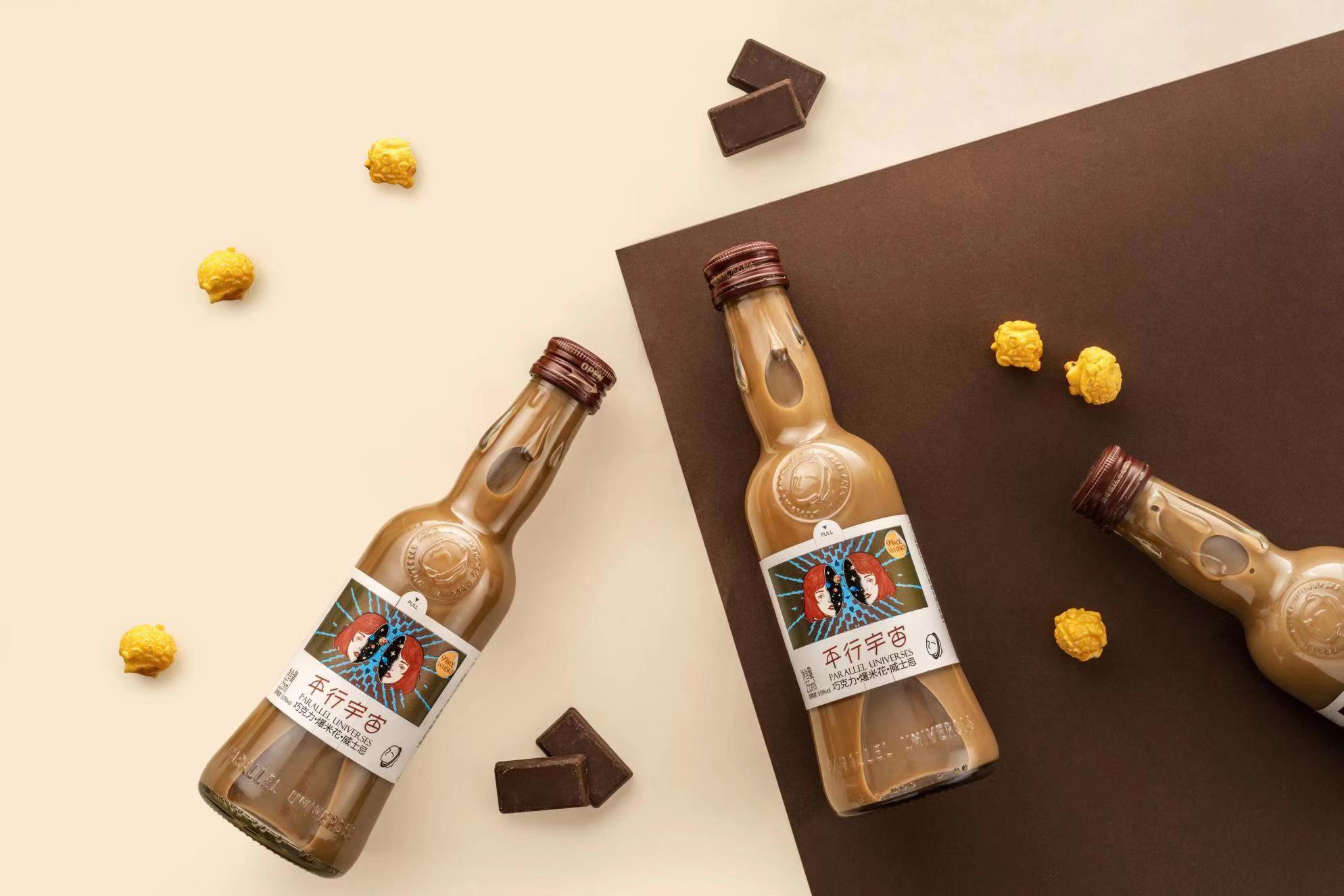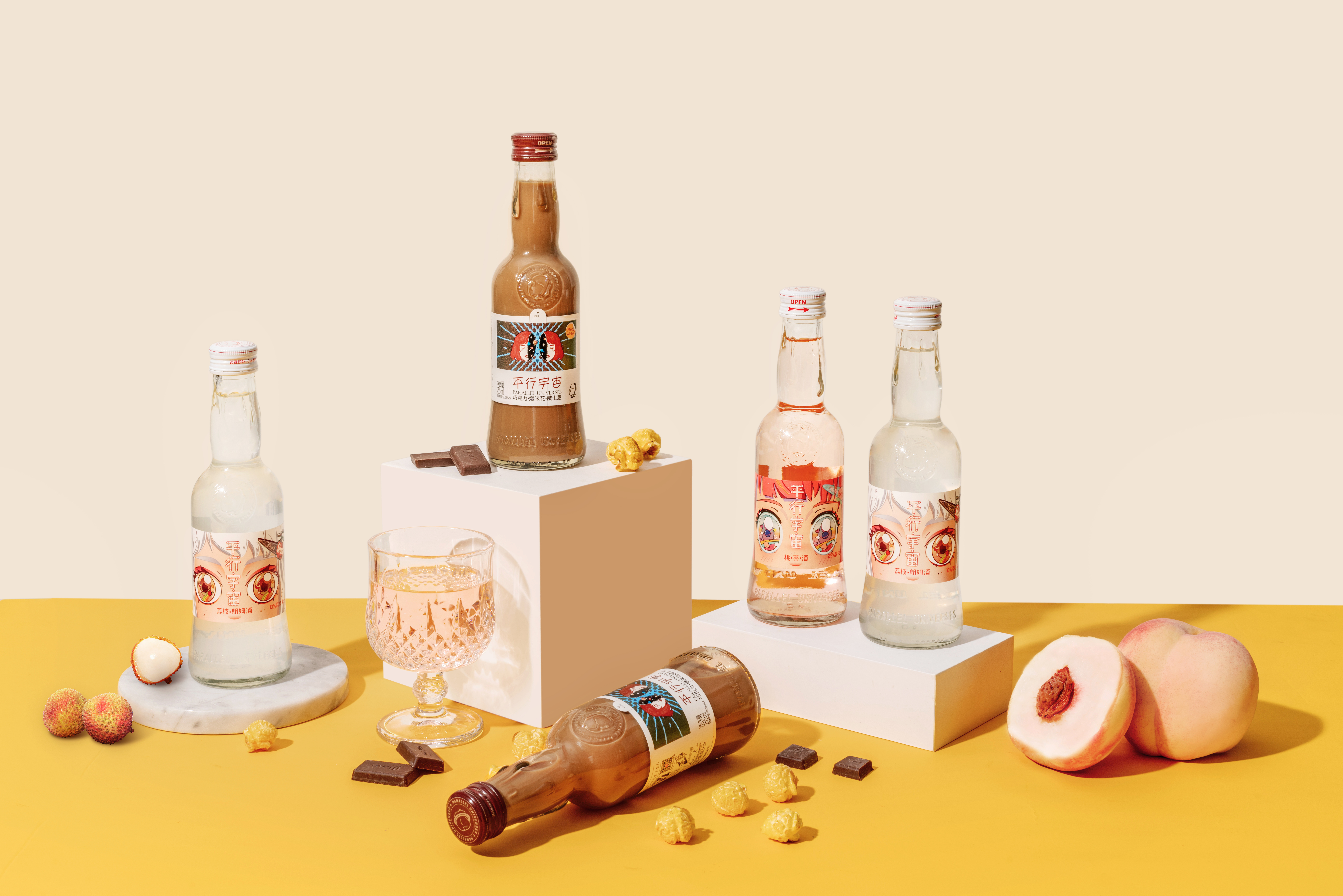 以“平行宇宙”系列为例,产品的定位是“女孩子的第一瓶酒”,基于刚刚成年的消费者,渴望探索世界,而酒精饮料像是一张通往成年的象征卡牌,因此做了低度酒饮料,同时以三款基酒:朗姆、金酒、威士忌做基酒来预调,做了蜜桃乌龙茶金酒风味(3度)、荔枝朗姆酒风味(3度)、巧克力爆米花威士忌风味(9度),既不完全脱离消费者的接受范畴,同时让口味充满想象空间,零售价在14.8元左右。
