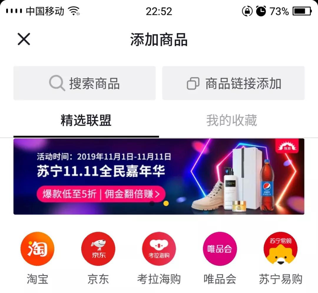 开通之后,通过抖音的精选联盟去添加商品,精选联盟主要和淘宝、京东、考拉海购、唯品会、苏宁易购这5个电商网站相关联。