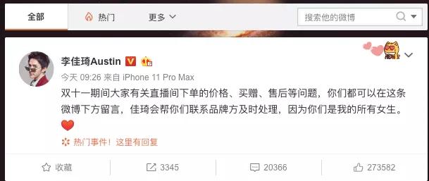 今天早上9点26分,李佳琦就发了一条微博,大意是请遇到售后等问题的网友留言,他来安排与品牌方处理。