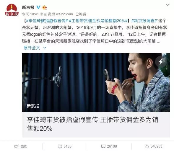 报道的螃蟹事件是在今年9月,憋了2个月才发布,尤其是在11月13日的双十一之后发布,媒体的意图非常明显:网红直播卖货是一个热点,李佳琦又是这个热点里最火的IP,关注度高就要关注,而我提前两个月就挖到的料,在当时发,肯定不如双十一之后更受关注。