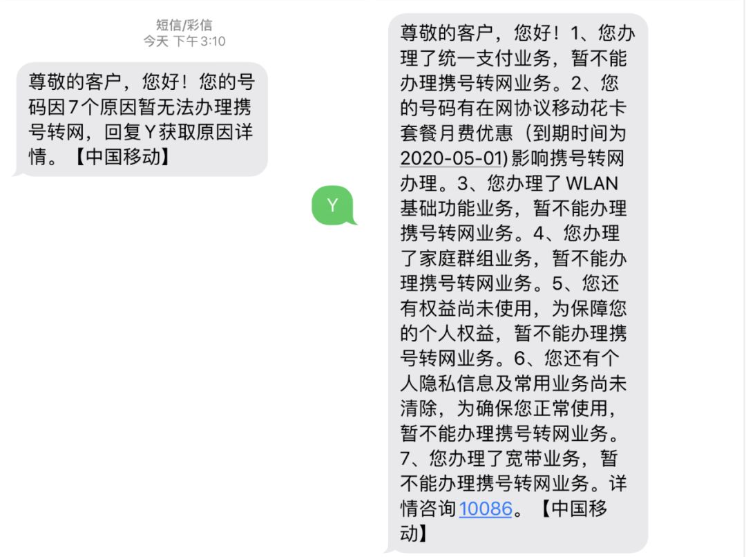 比如“携号转网”系统上线试运营后,我根据运营商提供的短信指令进行了携转资格查询,得到的结果是因7个原因无法办理携号转网,包括绑定了宽带业务、办理了WLAN、办理了家庭群组,以及字面上看不懂的统一支付业务、尚未使用的个人权益等等。简而言之,几乎失去了携号转网的资格。