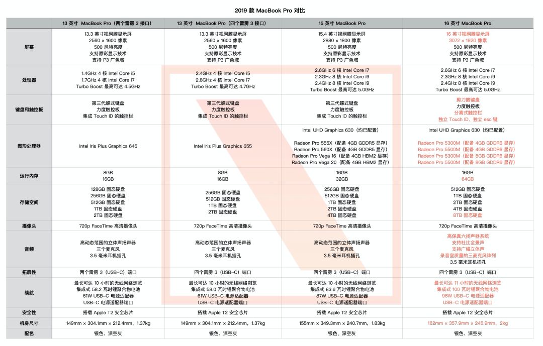 至于为什么没有用上最新的十代酷睿,原因和英特尔有关。你能看到的是,英特尔今年发布的两批 10nm 和 14nm 十代酷睿处理器,均只有 U 系列和 Y 系列,它们面向的是 MacBook Air 这类低功耗轻薄本,而非 Pro 这种高性能笔记本。