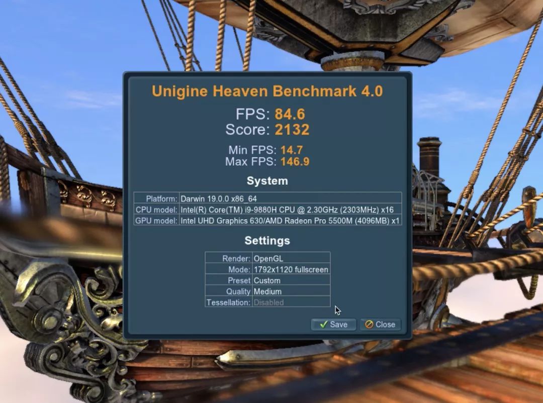 我们用 Unigine Heaven 软件测试也发现,16 英寸 MacBook Pro 高配版的显示帧率可以长期维持在 80fps 以上的水准,最终总分为 2132,比选配了 Radeon Pro Vega20 显卡的 15 英寸顶配款还要高 2 倍左右。