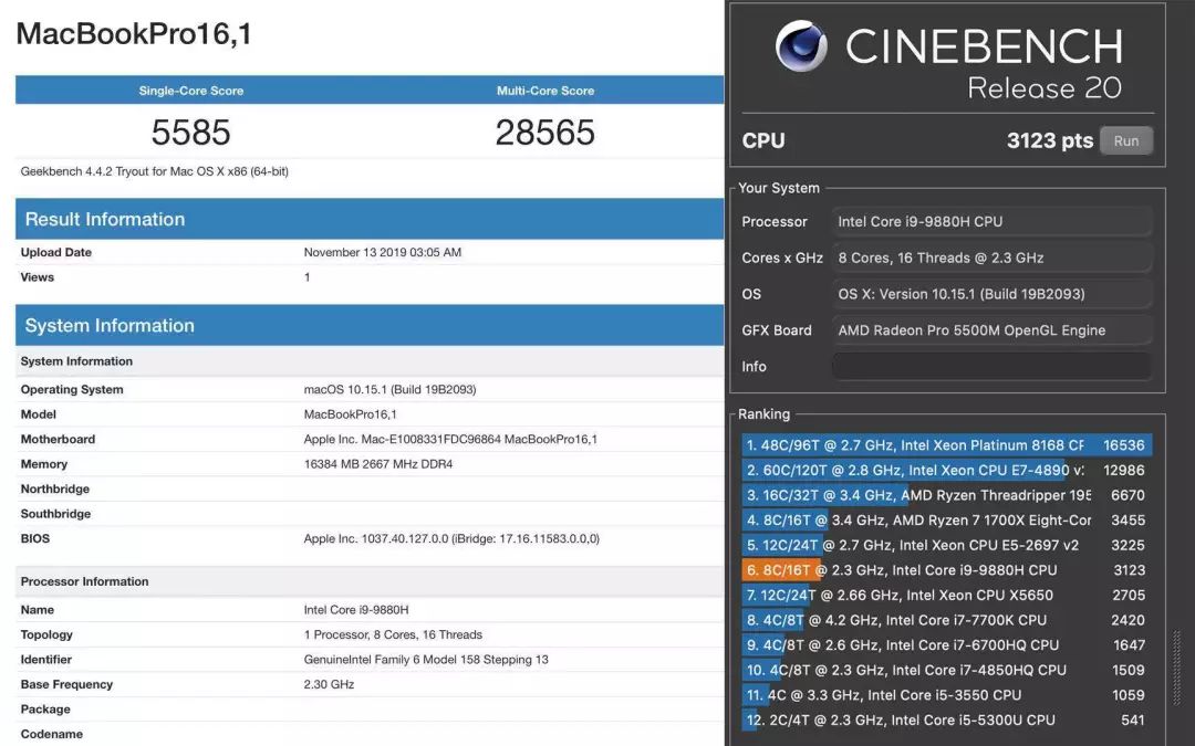 我们也使用 GeekBench 4 及 Cinebench R20 工具,对 16 英寸 MacBook Pro 高配版进行了测试,其中 GeekBench 4 的单核分数为 5585,多核分数为 28565,R20 分数则为 3123,也基本和 15 英寸 MacBook Pro 高配版处于同一个分数区间内。