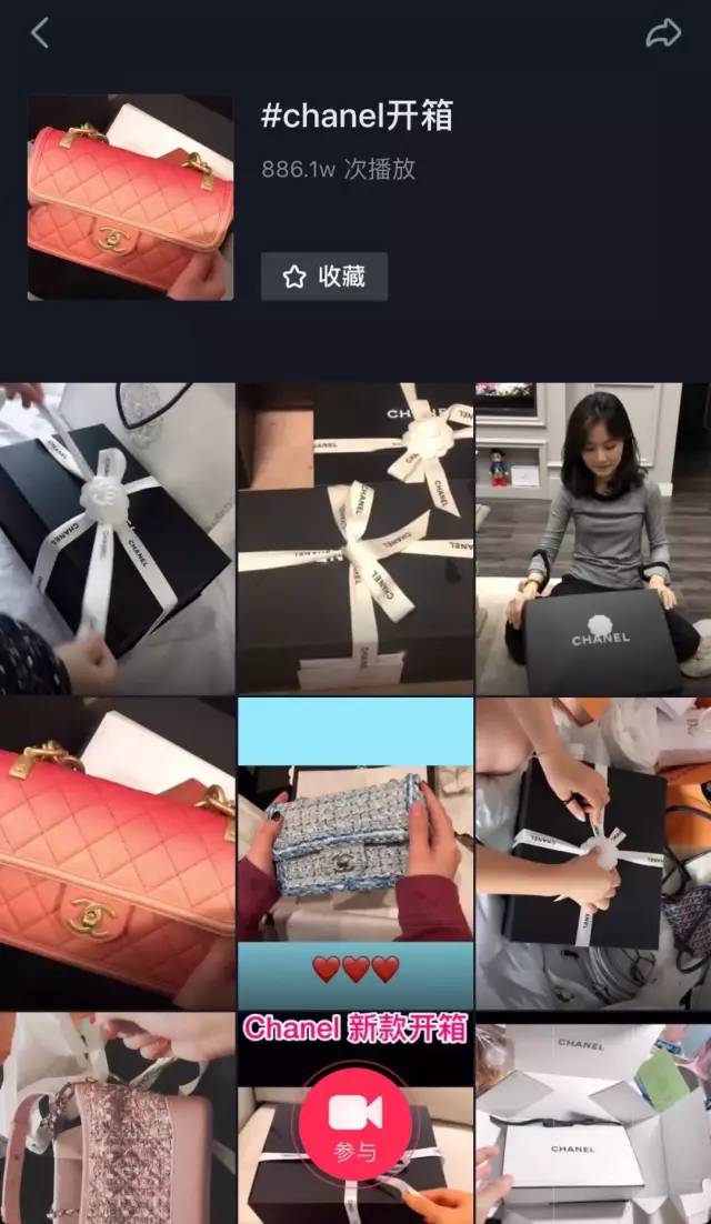 比如著名的香奶奶,我刷抖音的时候,经常能看到Chanel的话题,就拿#Chanel开箱#视频来说吧,这个话题一出,大家都很买账,参与度还挺高。