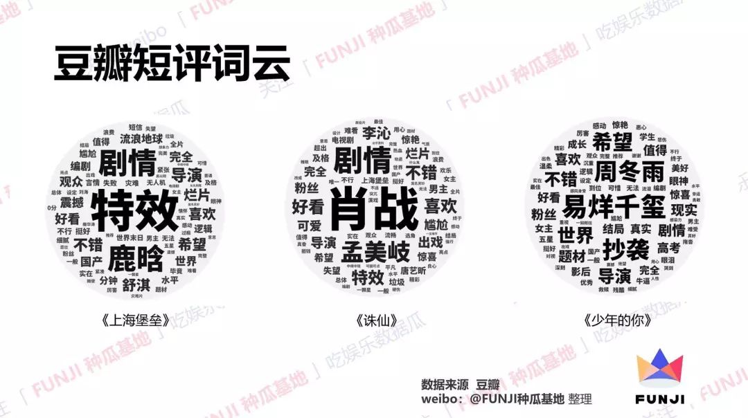 FUNJI(ID:FUNJIdata)在这三部电影的豆瓣短评中,抓取了各1000条样本,整理了三部电影的短评词云。