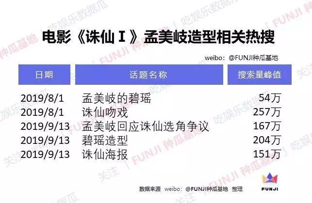 据FUNJI(ID:FUNJIdata)统计,在《诛仙Ⅰ》上映前和上映当日,共有五条内容与孟美岐造型相关的话题登上热搜,且皆偏向负面。