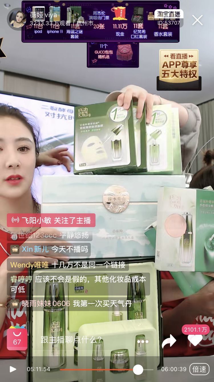 值得玩味的是,不久之后,百雀羚的产品却出现在了薇娅的双十一直播间中,并且看起来赠品满满。