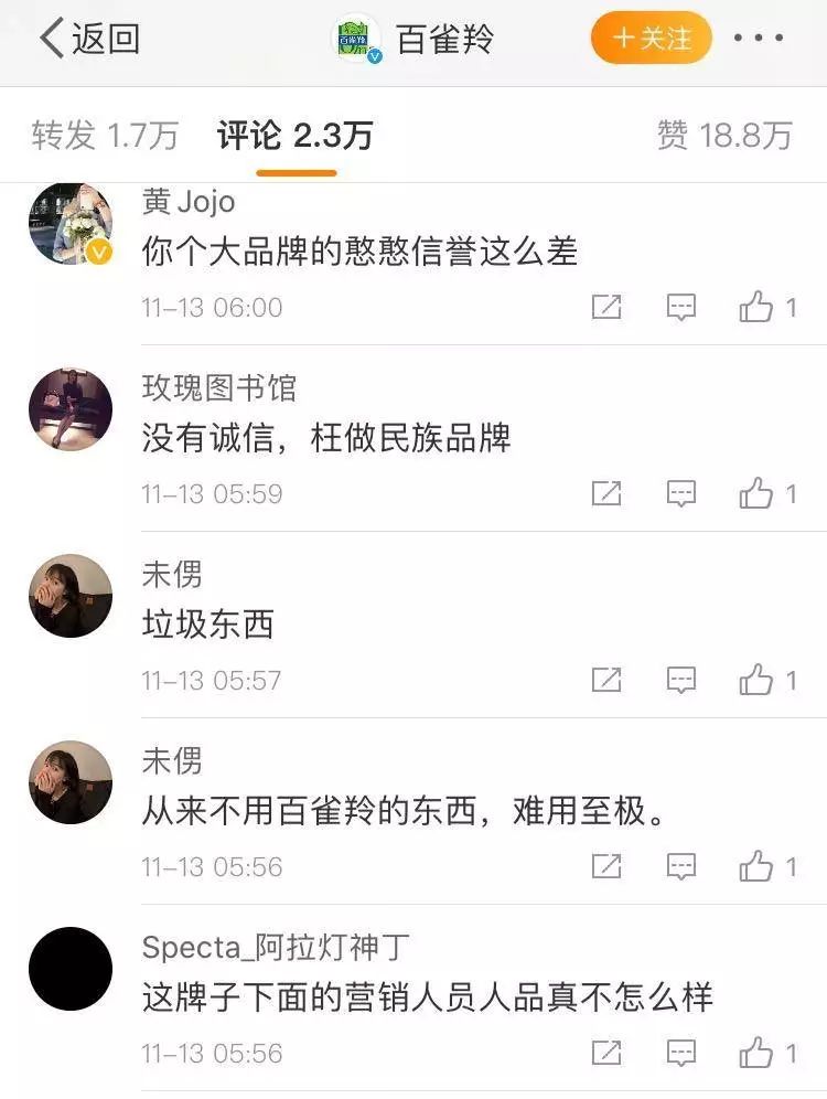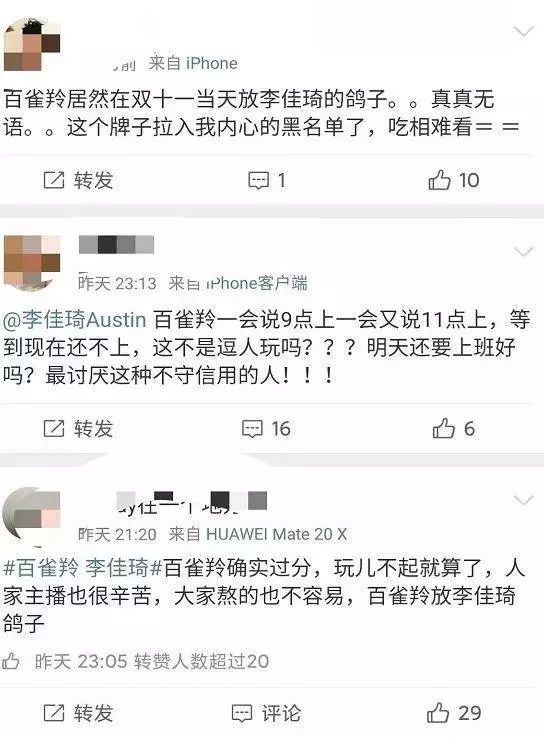 一直以来,百雀羚都被称为“国货之光”。这次放李佳琦鸽子事件,对于品牌方而言可能是一场最大的公关危机,是否会影响双11以及后续的口碑及销售量都将还是未知数。