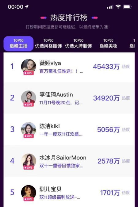 作为淘宝直播的两大顶流TOP,李佳琦和薇娅的battle由来已久,在双11预热开启的21日当天,两者的热度分别为33658万和55576万。而来到正式赛的11日当天,两人的淘宝直播均持续到11日的凌晨两三点钟。淘宝官方公开表示,薇娅本次双11的销售额已经达到了她去年全年的销售额,而2018年全年,薇娅引导成交销售额为27亿。