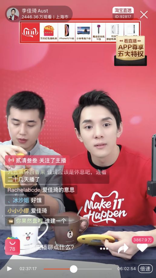 当他介绍完上一款保温水杯,再度标志性地提高声调,“我们!下面一个!百雀羚!”一旁的小助理付鹏却喝了口水,润润嗓子“百雀羚没有,今天”,同时依稀能听见一旁的画外音“百雀羚改天改天”。