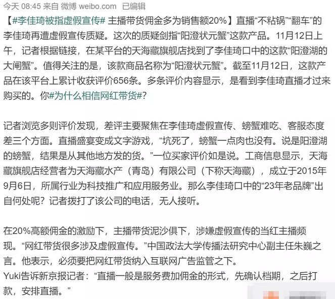 近两日新闻先后爆出的百雀羚放鸽子李佳琦,以及李佳琦大闸蟹被指虚假宣传,都折射出淘宝直播江湖背后的刀光剑影。