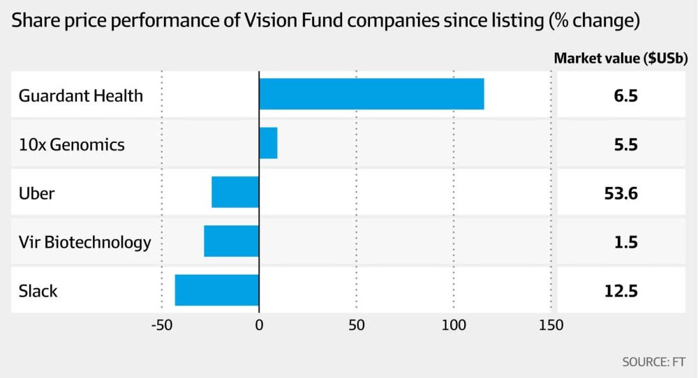 Uber股价目前较其上市价格下跌31%,愿景基金自投资以来遭遇逾8亿美元的账面亏损。其他投资也受到了影响:办公通讯公司Slack股价自6月首日交易以来下跌了近45%,而Vir Biotechnology自10月中旬上市以来下跌了30%。只有两家愿景基金支持的公司Guardant Health和10X Genomics股价高于IPO价格。