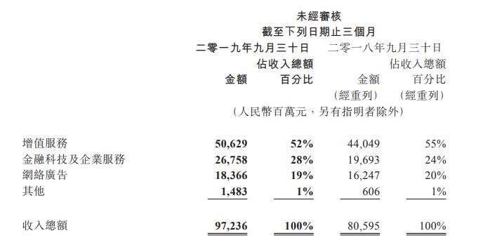 增值服务业务仍然是腾讯收入的主要贡献者,第三季度增值服务收入为506.29亿元人民币,同比增长15%。其中,网络游戏收入260.46亿元,同比增长11%,在总收入中占比达到28%;包含视频、音乐、直播等的社交网络收入220.25亿,在总收入中占比23%。