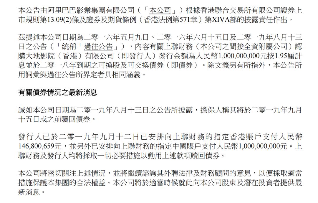 另一方面,2016年5月,阿里影业认购了大地影院总额10亿元的可转债。而这笔可转债已于今年到期,到期后阿里影业并没有选择转股。9月13日,南海控股和阿里影业同时发布公告,表示这笔债务已结清。这笔11.47亿元的支出将为南海控股带来更大的现金流压力。