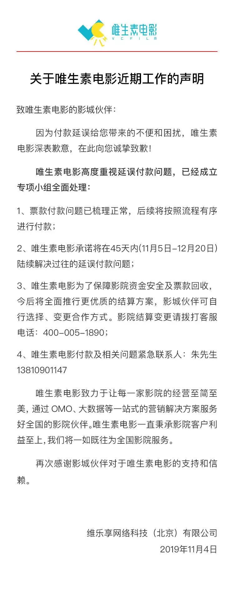 次日凌晨一点,老薛就接到了不明人士的电话,“放哥们儿一条活路吧,不要搞什么媒体曝光了,要多少钱我给你。”在老薛表示有录音之后,对方愣了下,说了没几句就挂断了电话。当天晚上11点半,VC电影通过公众号发出声明,表示将在45天内陆续解决延付问题。