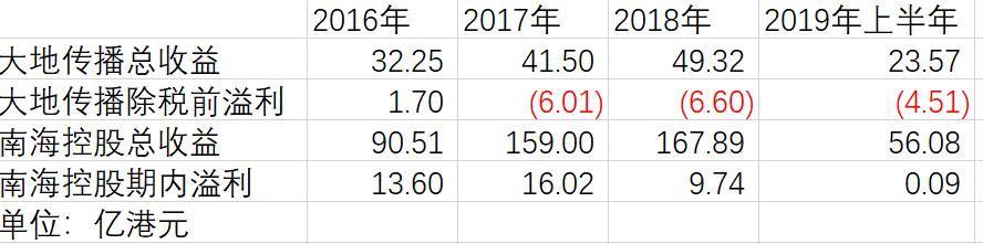 和频繁的人事变动相对应的,是大地传播逐年下滑的业绩。据南海控股2019年中报,大地传播今年上半年税前亏损4.51亿港元,同比下降162%。其母公司南海控股也不好过,上半年净利润为0.09亿港元,同比下降99%。