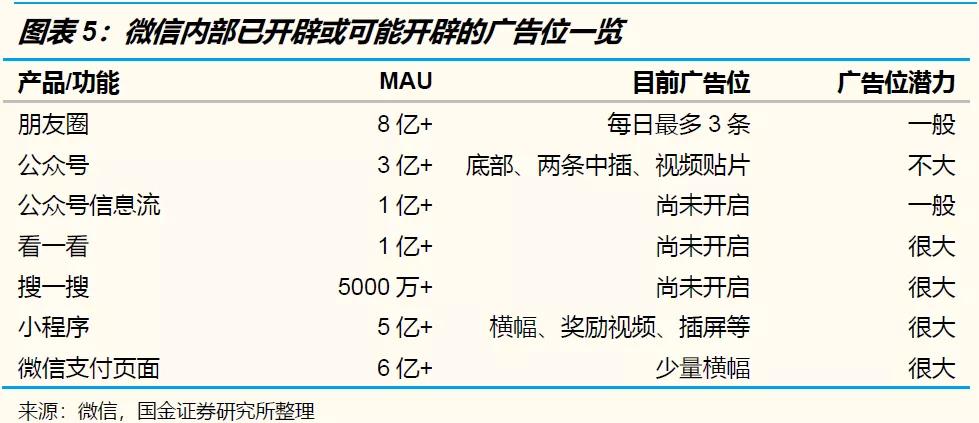 腾讯广告业务存在很多问题——销售能力不强、内部数据未打通、组织架构尚未理顺,而长期增长的机遇仍然在于微信。如果微信团队愿意对广告主开放更多用户数据(前提是合规)、释放更多广告位,微信广告仍有很大的上升空间。虽然朋友圈和公众号AdLoad上升空间不大,但是“看一看”“搜一搜”和小程序仍有大量的潜在广告位。
