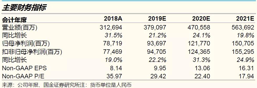 我们估计腾讯2019-21年收入CAGR 21.7%,Non-GAAP净利润CAGR 26.1%;Non-GAAP EPS分别为人民币9.95/13.06/16.31元。基于SOTP法得到目标价398.50港元。维持“买入”评级。