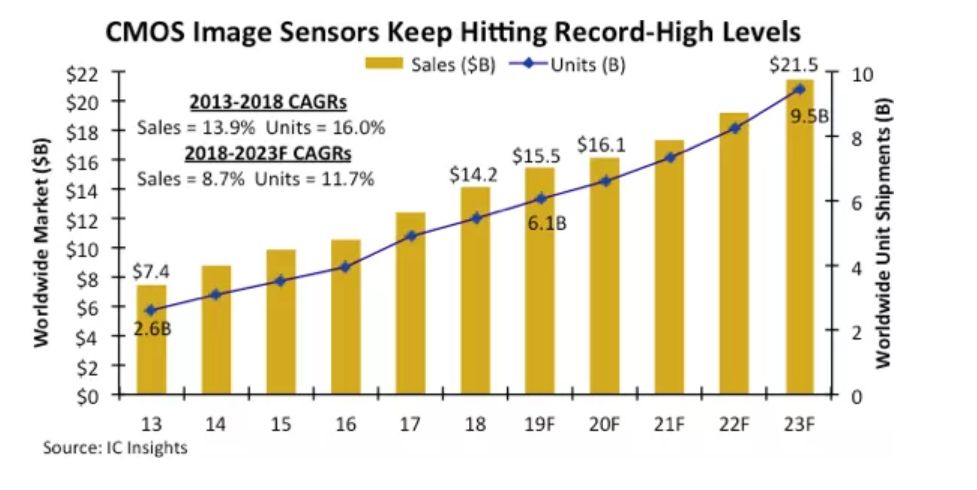 根据ICinsights之前的数据预测,2019年CMOS图像传感器出货量将增长11%,达到全球创纪录的61亿颗,随后全球经济预计将进入衰退领域,2020年将增长9%,达到66亿颗,部分原因在于美中之间的摩擦。2018年,CMOS图像传感器的收入增长了14%,达到142亿美元。而2017年增长了19%。自2011年以来,CMOS图像传感器的销售额每年都创下新的高位,连续的记录预计将持续到2023年,届时销售额将达到215亿美元。
