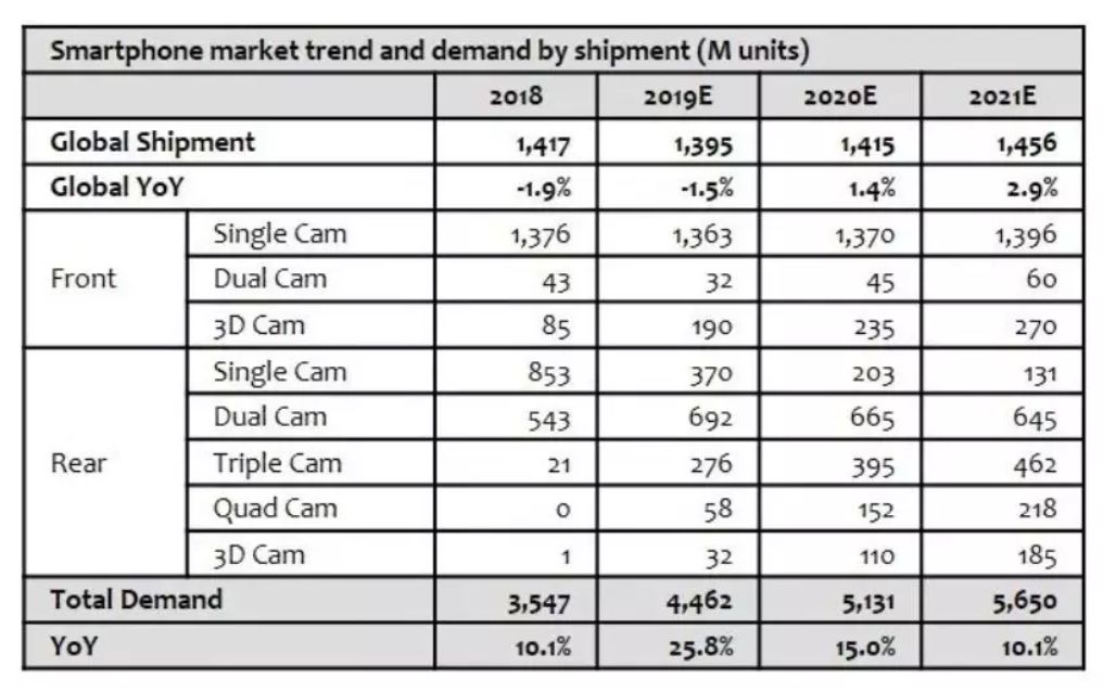 根据IHS Market的最新数据指出,尽管全球智能手机市场下降,但摄像头市场在2019年仍在增长。考虑到图像传感器尺寸正在增加40%—50 %,此外,摄像头也从16MP升级到48MP甚至64MP,使得相关晶圆总需求在2019年也将增加约50%。