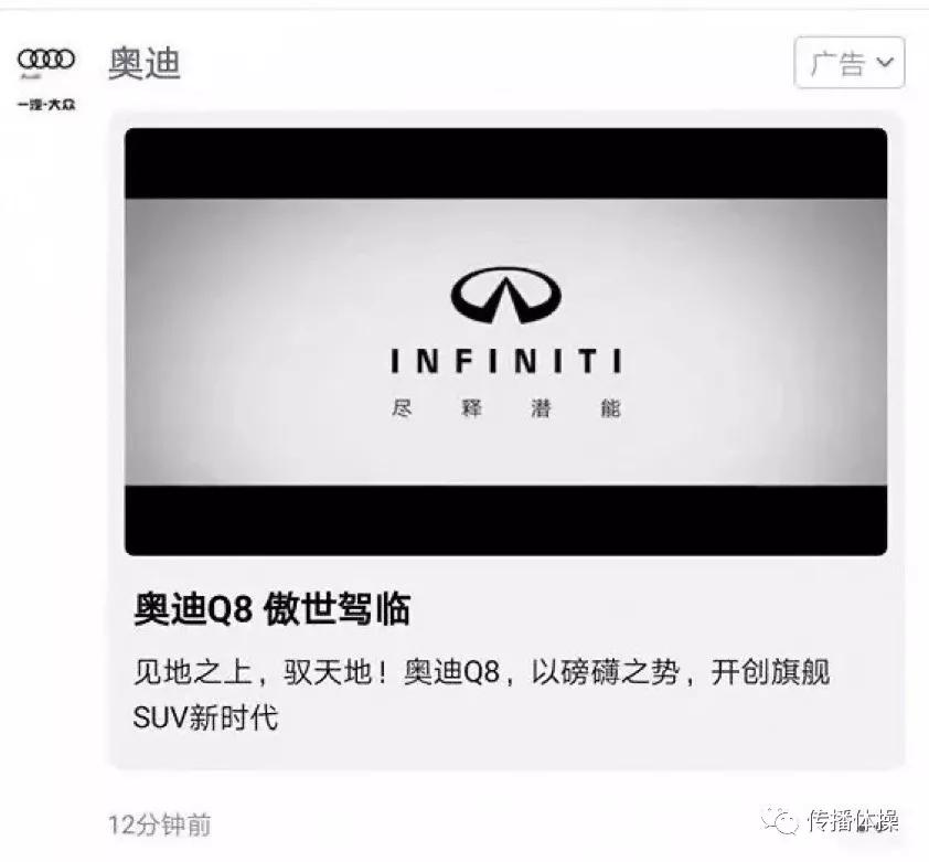 第二个是奥迪在朋友圈投放了英菲尼迪的广告,搞出了个乌龙事件,网友们喜闻乐见。