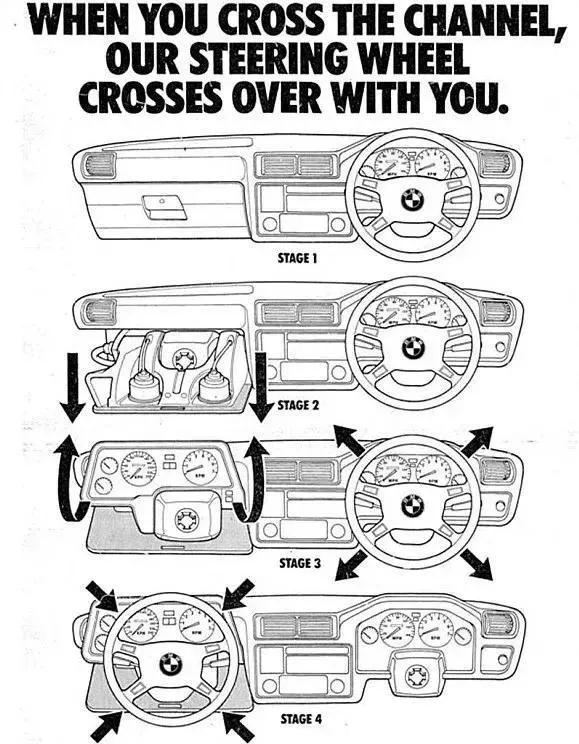 于是宝马的工程师提出了一个革命性解决方案,他们发明了汽车史上第一个“交互式方向盘”,具体操作只需四个步骤:打开手套箱,翻出仪表盘,拆掉下方向盘,装到副驾上。不过图解并没有说明油门和刹车的问题怎么解决。